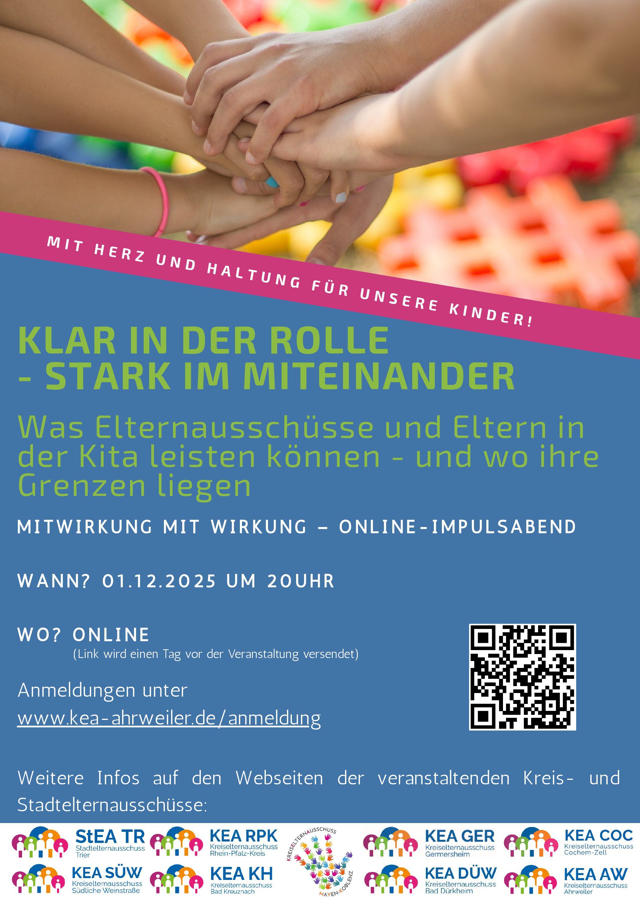 Der Kreiselternausschuss Germersheim (KEA GER) und acht weitere Kreis- und Stadtelternausschüsse aus Rheinland-Pfalz laden Sie herzlich zu einer Online-Veranstaltung ein. Unter dem Motto „Mit Herz und Haltung für unsere Kinder“ zeigen wir, wie Eltern gemeinsam mit Kita-Leitungen, Fachkräften und Trägern das Miteinander in der Kita gestalten und damit gute Bedingungen für die Kinder schaffen können.